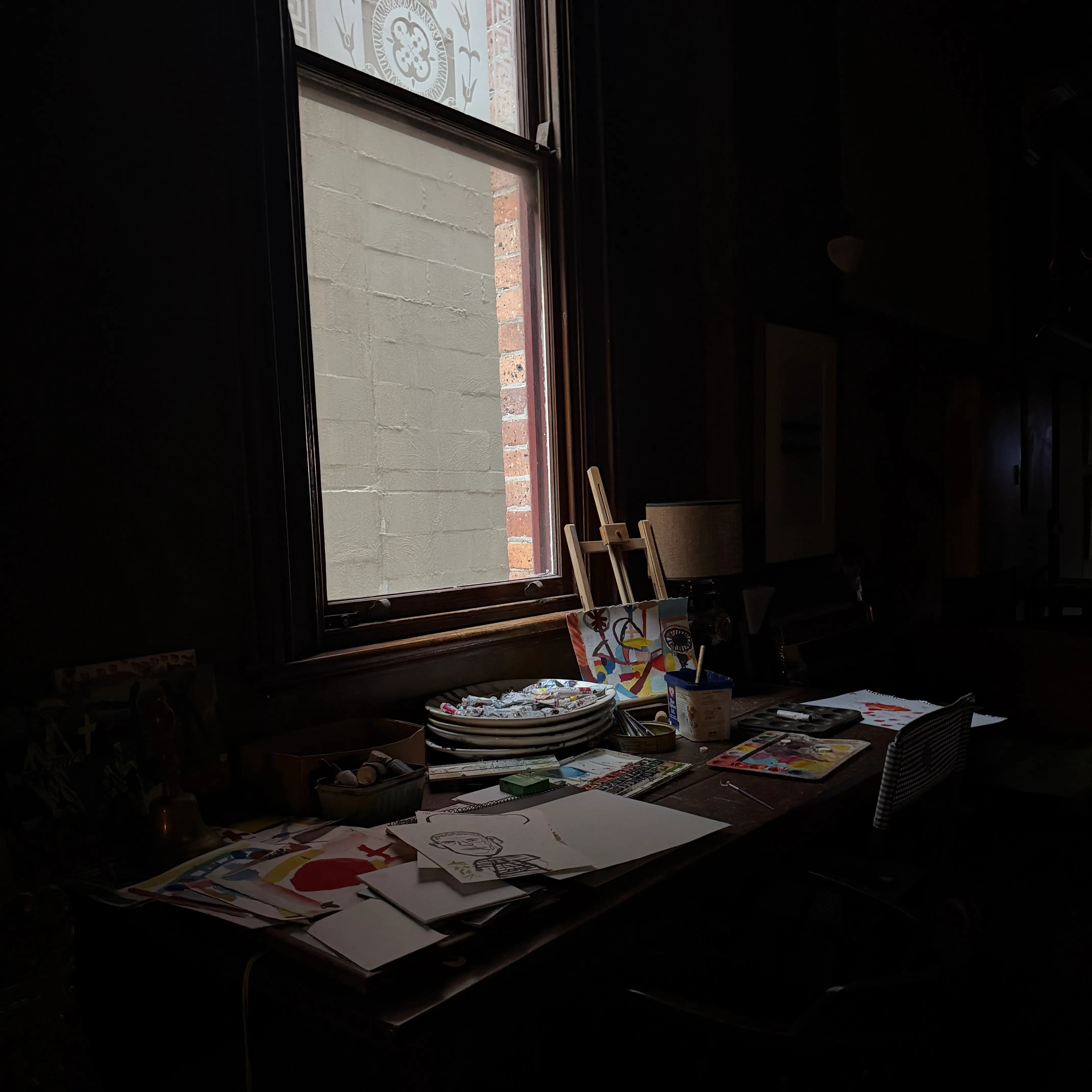Inside, it has been adapted rather than preserved into stillness. The building now holds two distinct studio spaces - his and hers - as distinctive as their work and the mediums they work in. Each has its own rhythm and discipline. Both are clearly working environments. Light moves cleanly across worn boards. Canvases shift as work develops. Nothing feels staged.