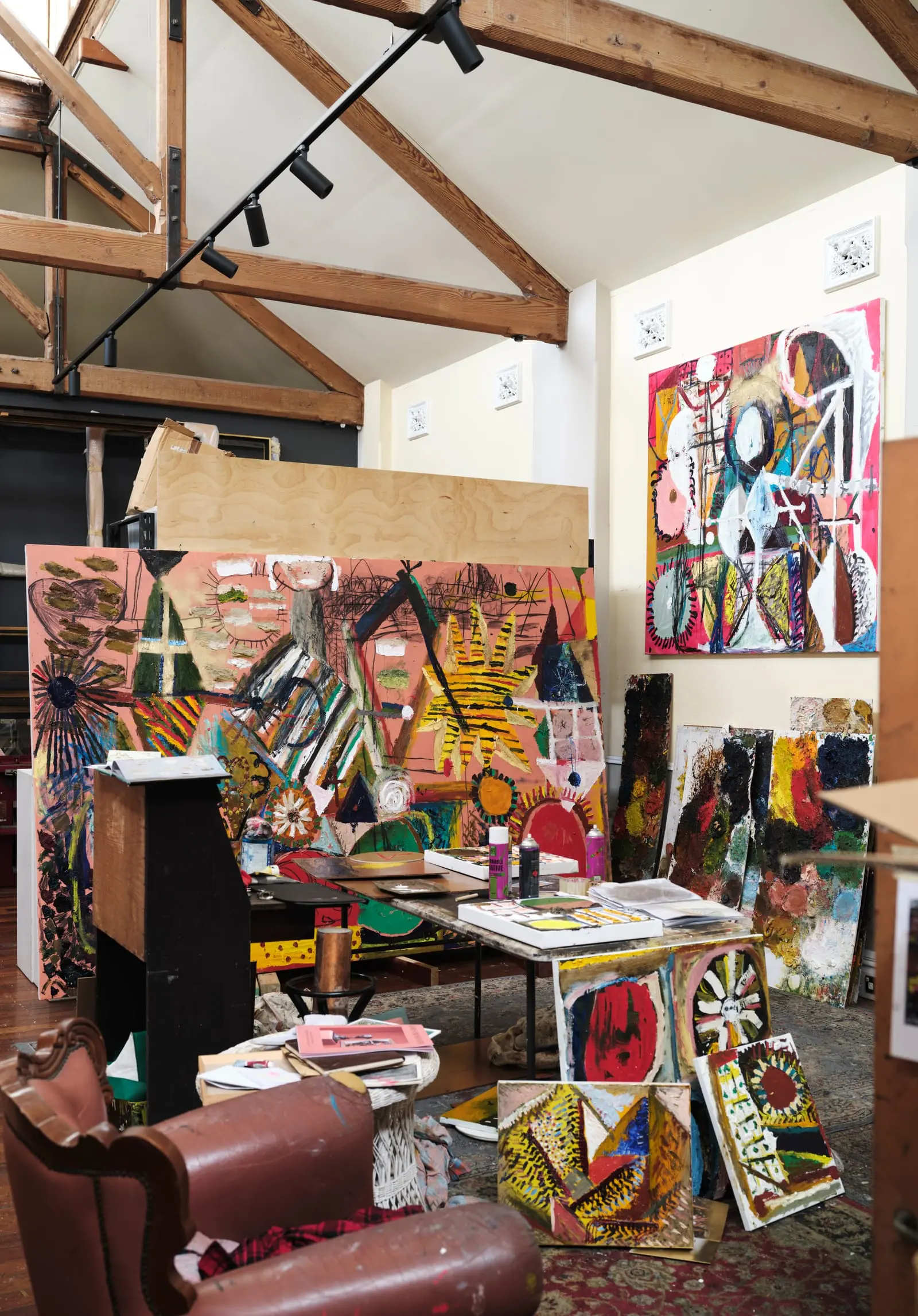 Throughout the rooms, their own paintings sit alongside works by artists they respect. Pieces lean before they are hung. Books stack where they are being read. The house reflects process rather than presentation. It feels active and purposeful.