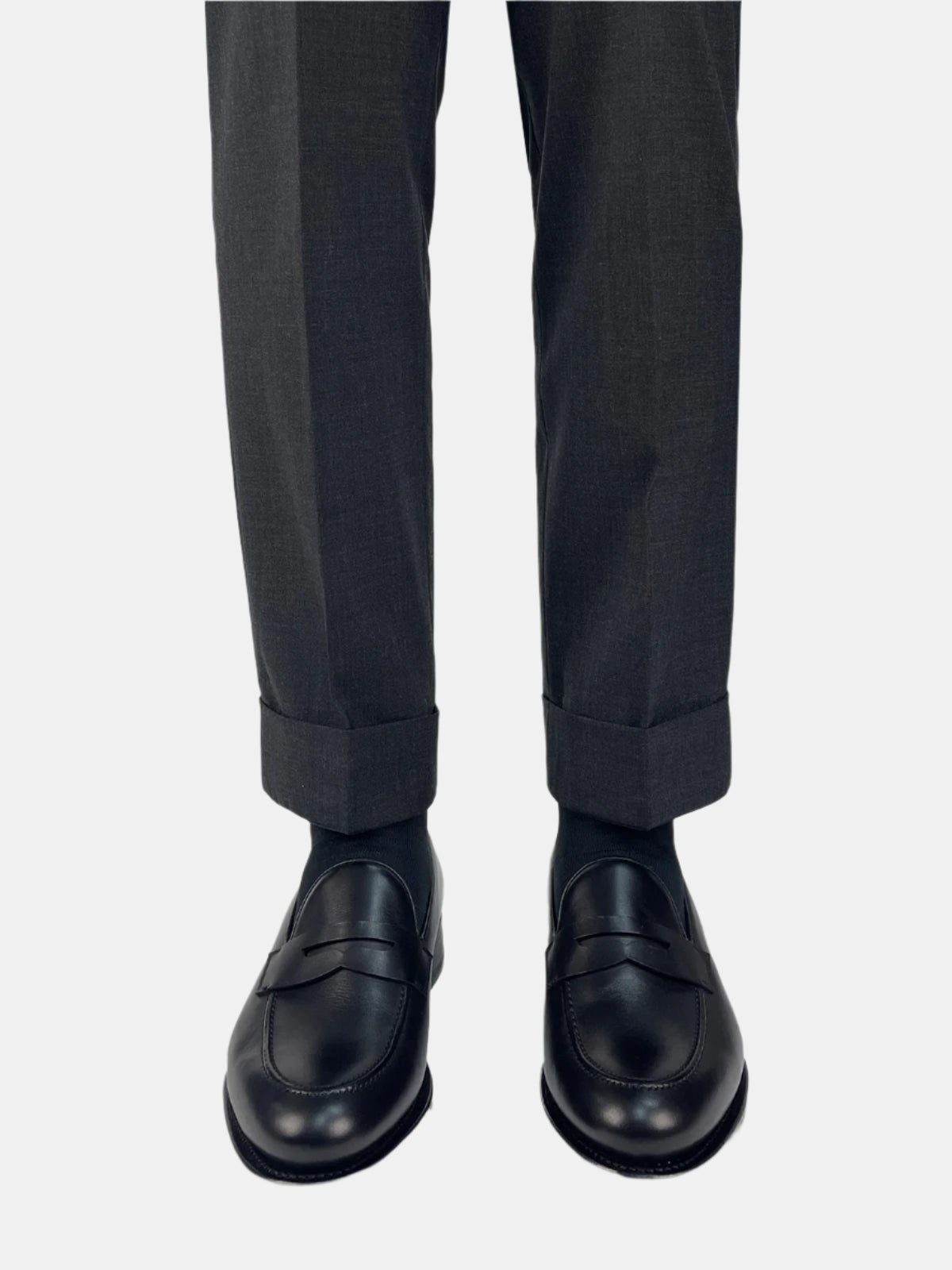 A black box calf penny loafer embodies classic refinement and comfort. Made in Italy from supple box calf leather, it combines a polished appearance with flexible construction. Its traditional saddle strap and understated profile make it a timeless essential.